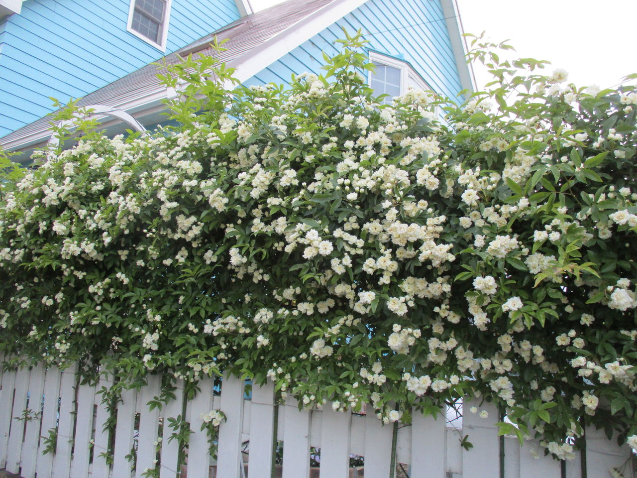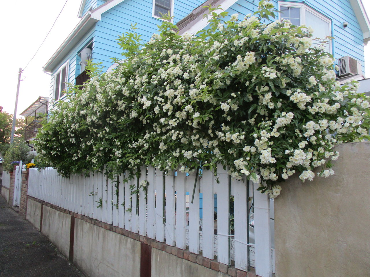 小さな庭のフェンス上の白いモッコウバラが咲きました。