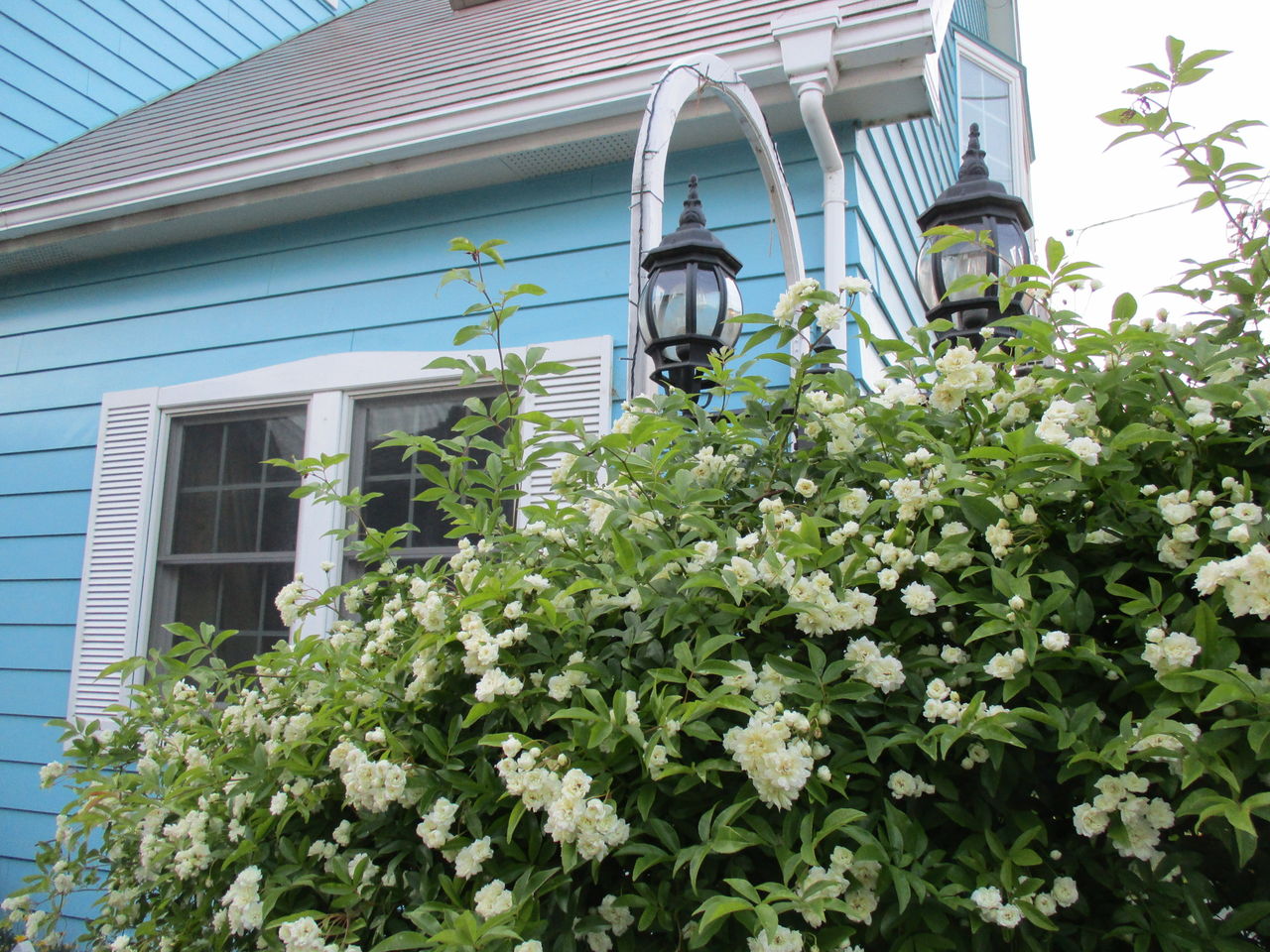 DIY製作しました、フェンスの白いモッコウバラが咲きました。